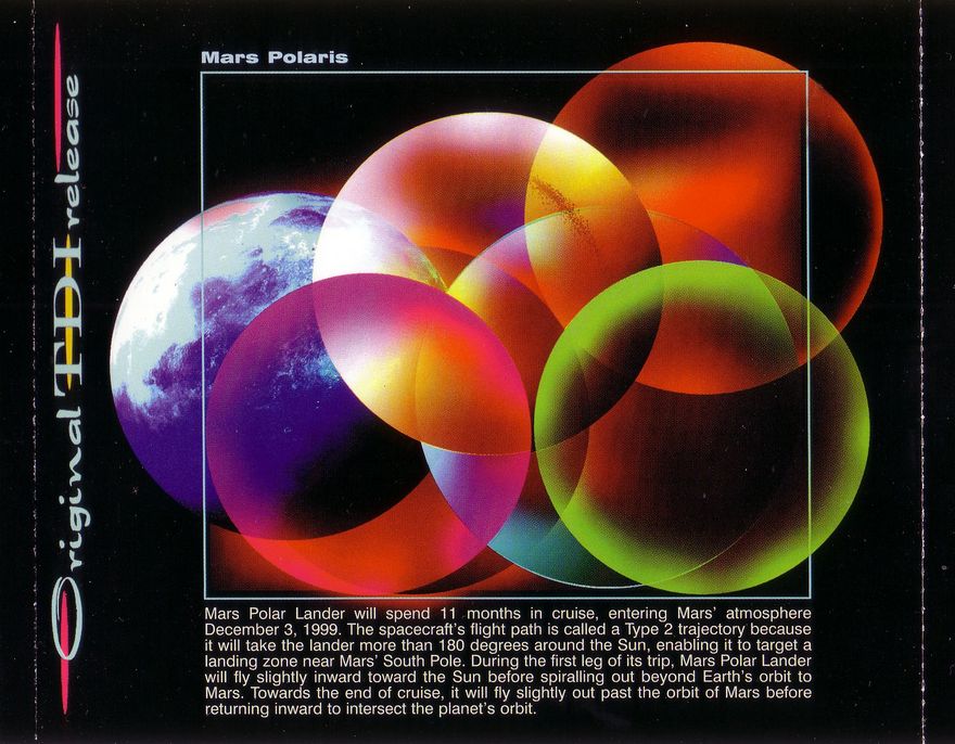 | The information about the Mars Polar Lander and its photo on page 3 of the mispressing are unique for this release. They were not used for the official release at all. Only a small excerpt of the large photo showing Mons Olympus was re-used at a larger scale on page 5 of the official release. |